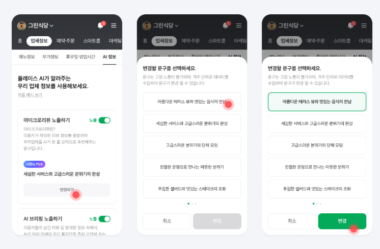 노출 여부와 AI 추천 문구 중 노출할 문구를 선택할 수 있습니다.